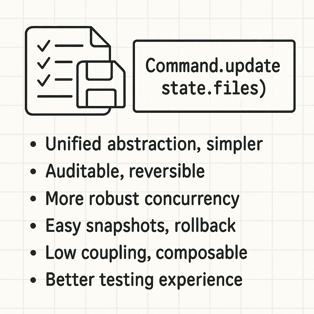 更好测试体验:- 单测无需真实磁盘,直接构造/断言 state.files