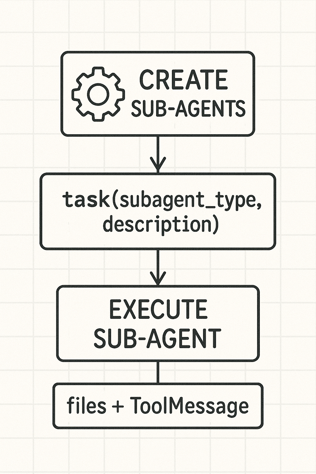 作为一条用户消息投递给对应的子代理;子代理独立执行后,产出的结果会以“文件变更(files)+ 一条工具消息(ToolMessage)”的形式回填到主状态。